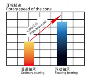 the rotary speed acceptable for the cone can be increased by 1 time if under the same working conditions of the driling well, and the heat generated by the friction of sliding can be significantly reduced, extending the service life of the bit